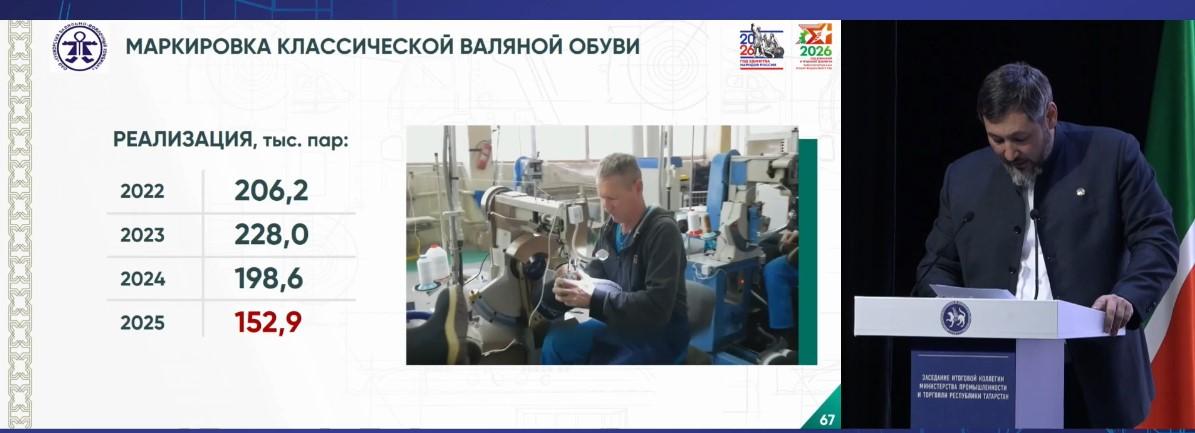 Министр промышленности и торговли Татарстана Олег Коробченко заявил, что введение обязательной маркировки для валенок негативно отразилось на Кукморском валяльно-войлочном комбинате. Эта мера, действующая с 2020 года, привела к росту цены на обувь и снижению потребительского спроса.