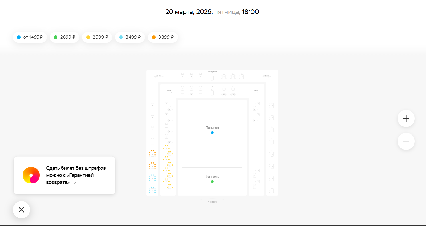 Выступление состоится 20 марта в 18:00 в казанском концертном зале «Корстон». Стоимость билетов колеблется от 1499 до 3899 рублей. Согласно анонсу, билеты, приобретенные на отмененное мероприятие, сохранят свою силу.
