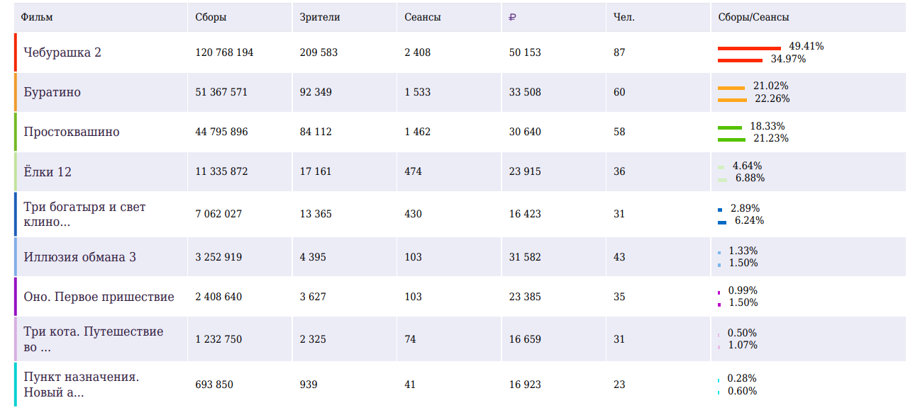 В масштабах всей России «Чебурашку» посмотрели 6,8 миллиона зрителей, «Простоквашино» — 3 миллиона, «Буратино» — 2,8 миллиона. Интересно, что «Буратино» всего за четыре первых дня проката преодолел отметку в один миллиард рублей.