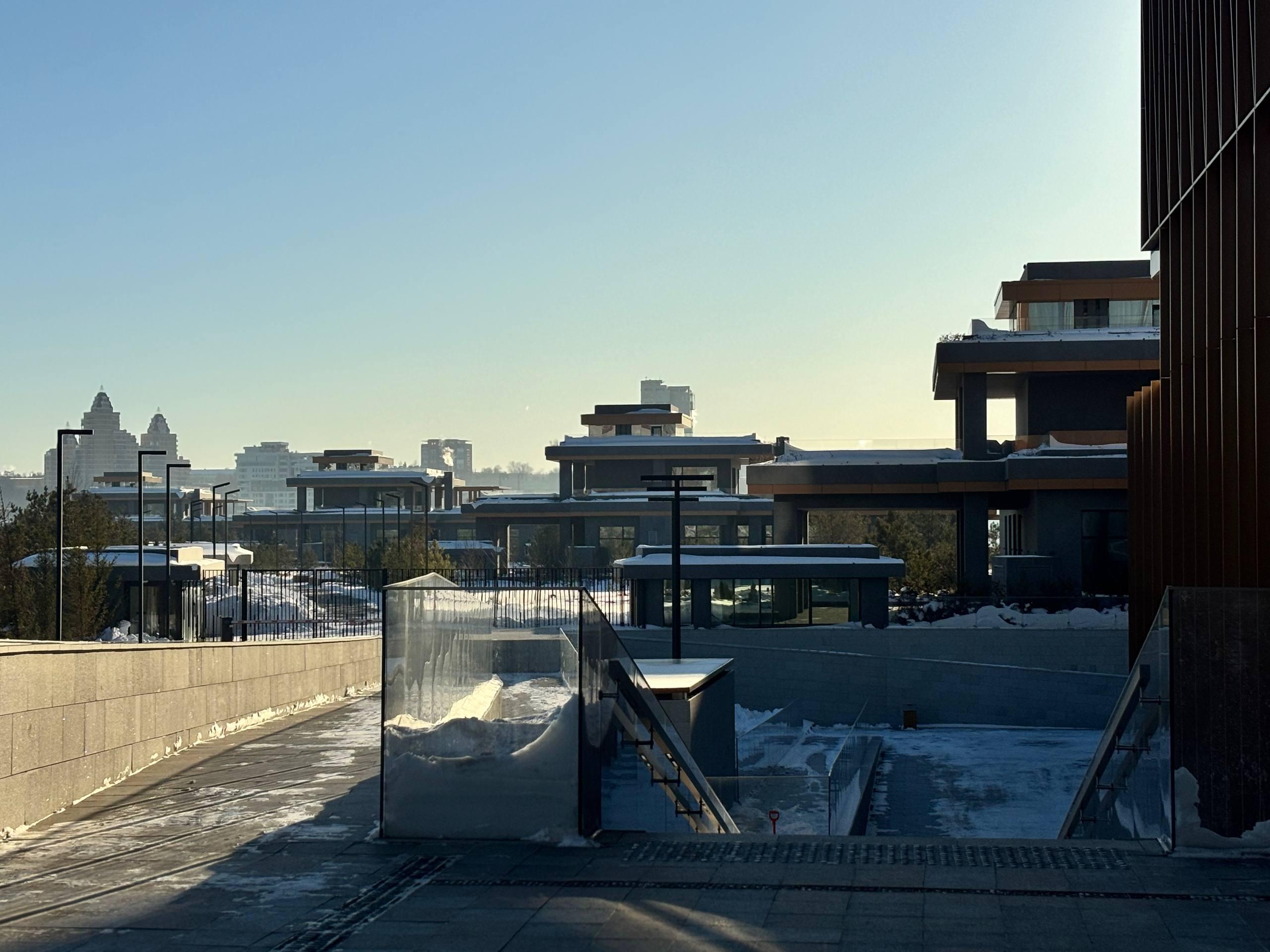 Строительство остальных башен комплекса продолжается, всего их планируется пять. Рядом с уже открытыми корпусами, за ограждением, видны вип-отели, не очищенные от снега.