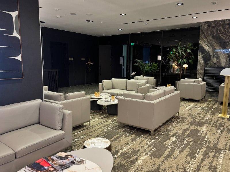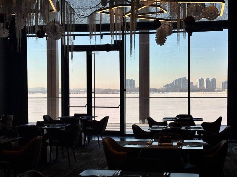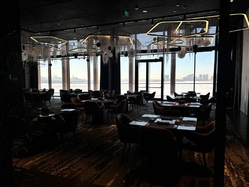 Зона ожидания обставлена белыми диванами, столиками и оборудована барной стойкой. Вдоль коридоров расставлены высокие декоративные растения. Далее находится ресторан с панорамными окнами, из которых открывается вид на реку Казанку.