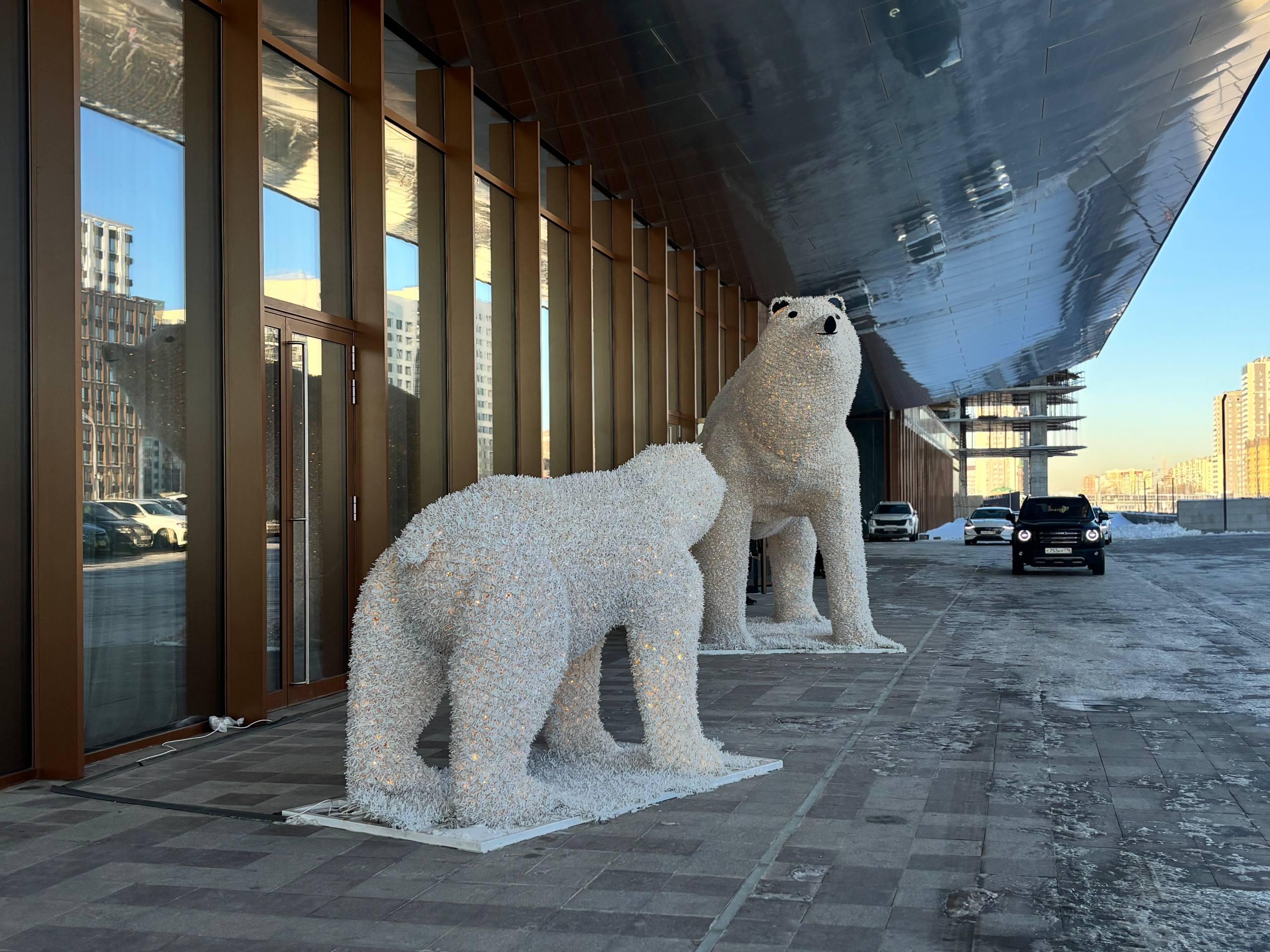 В холле пятизвездочного отеля до сих пор сохраняется новогоднее убранство. У входа размещены две крупные фигуры белых медведей, а в лобби стоят наряженные ели с декоративными подарками.