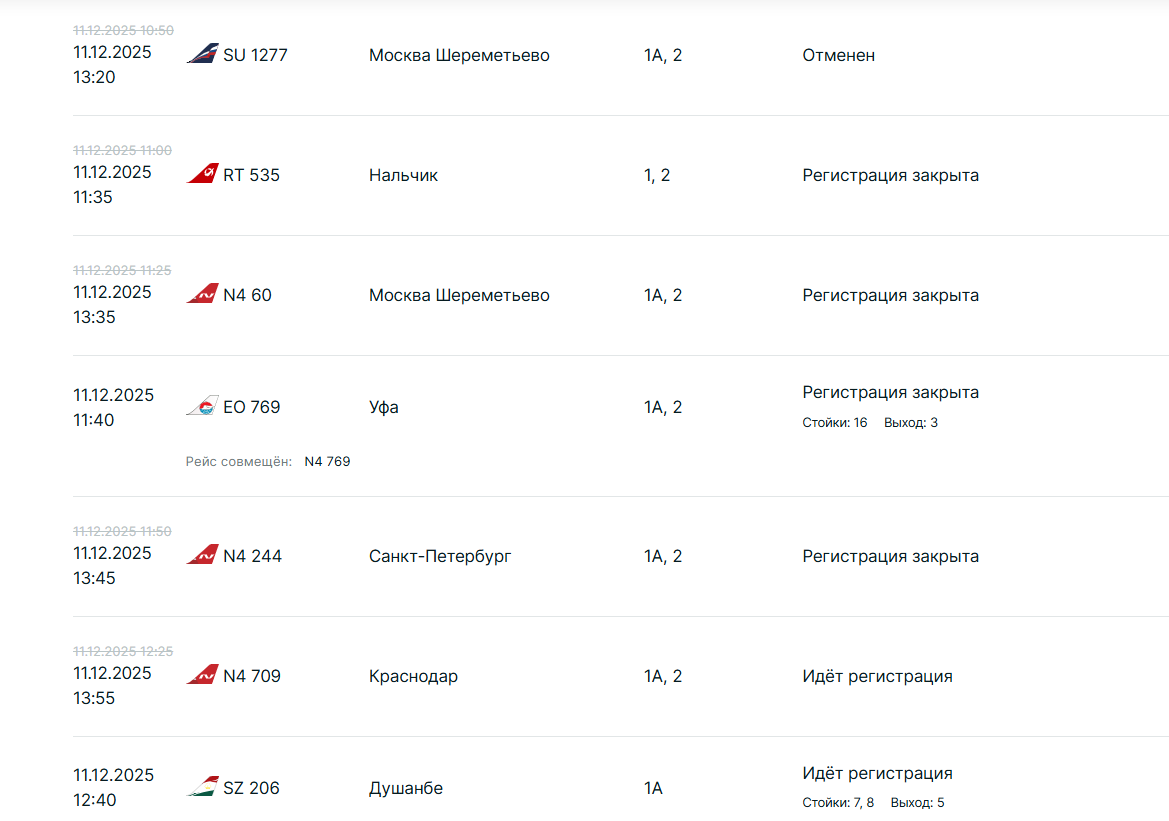 Кроме того, были отменены прилёты из Екатеринбурга, Калуги и Москвы, а также два рейса вылета в столицу.