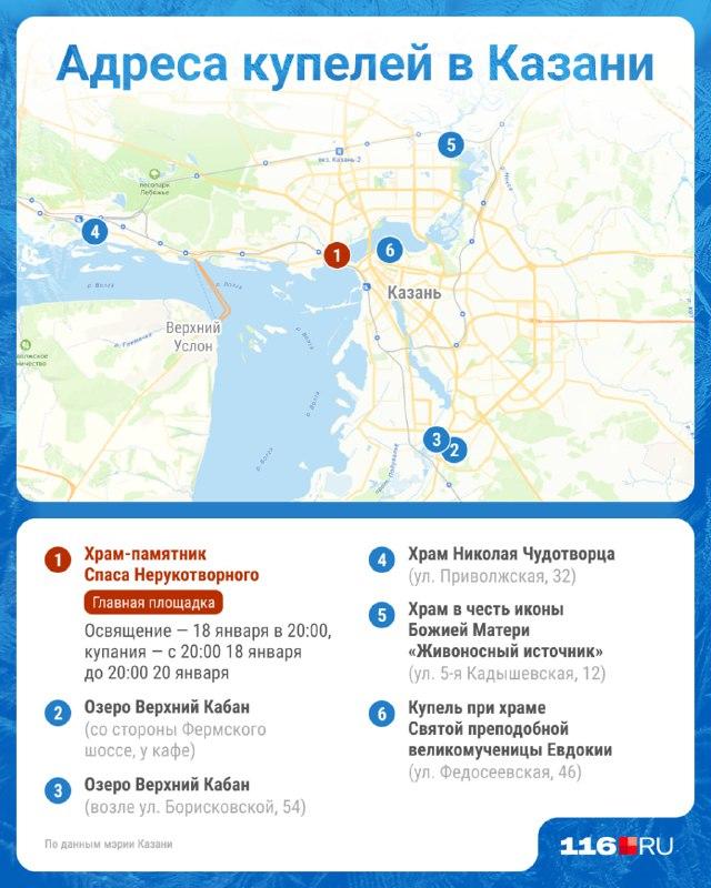 Православные верующие в Казани 19 января смогут совершить омовение в освящённой воде. Для этого организовано шесть специальных зон, включая купель у храма-памятника Спаса Нерукотворного. На данной площадке купания не проводились с 2021 года.