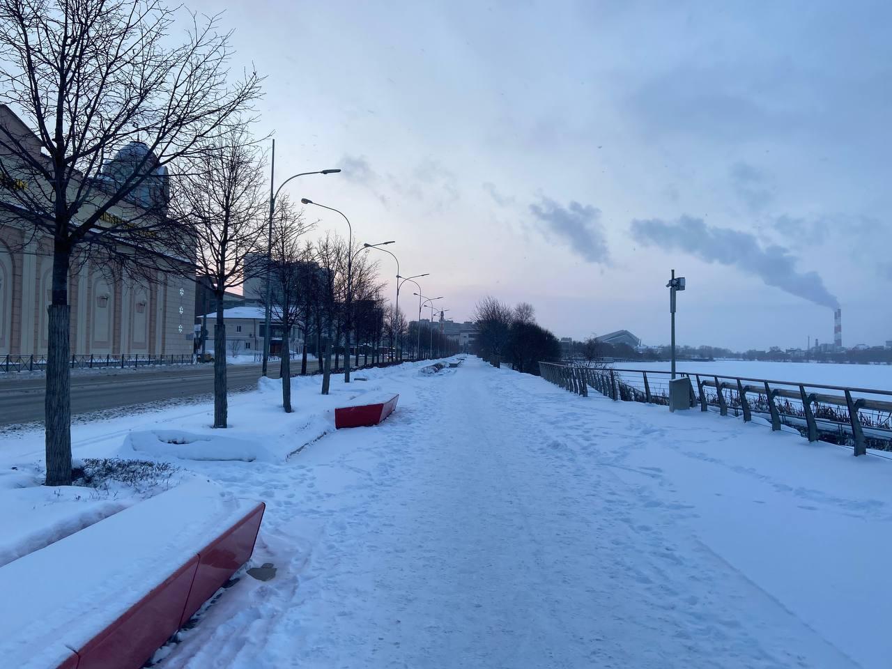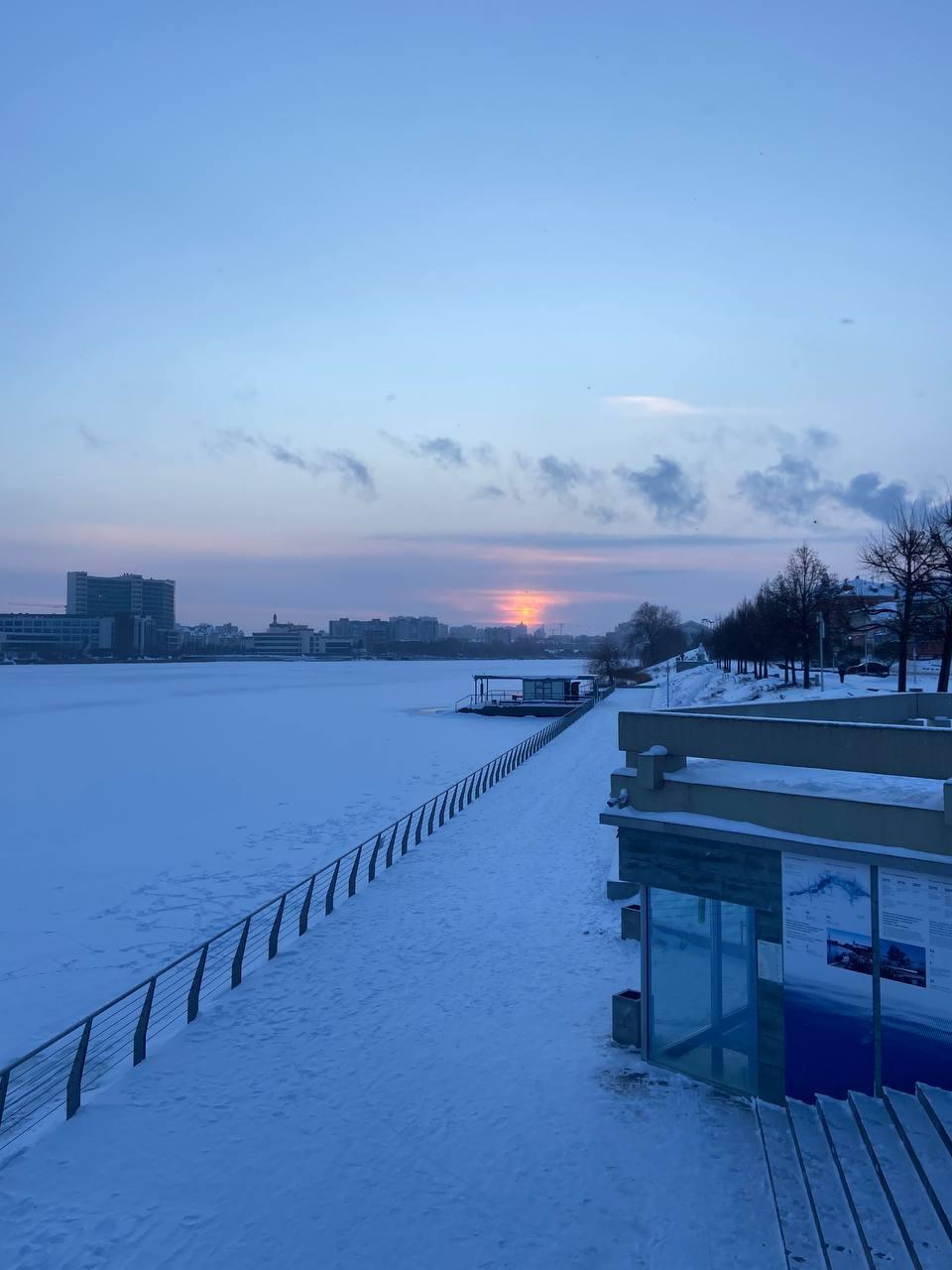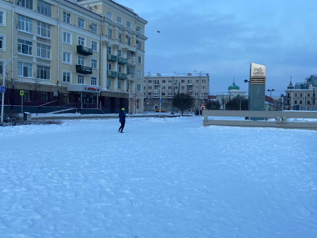 Набережная озера Кабан была абсолютно пуста. Театр имени Камала в одиночестве встречал первый день 2026 года на фоне дымящих труб ТЭЦ, а на заснеженной глади озера виднелись следы лыжника.