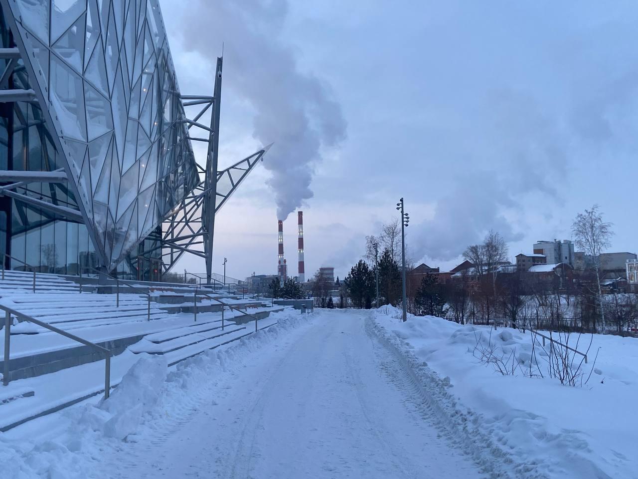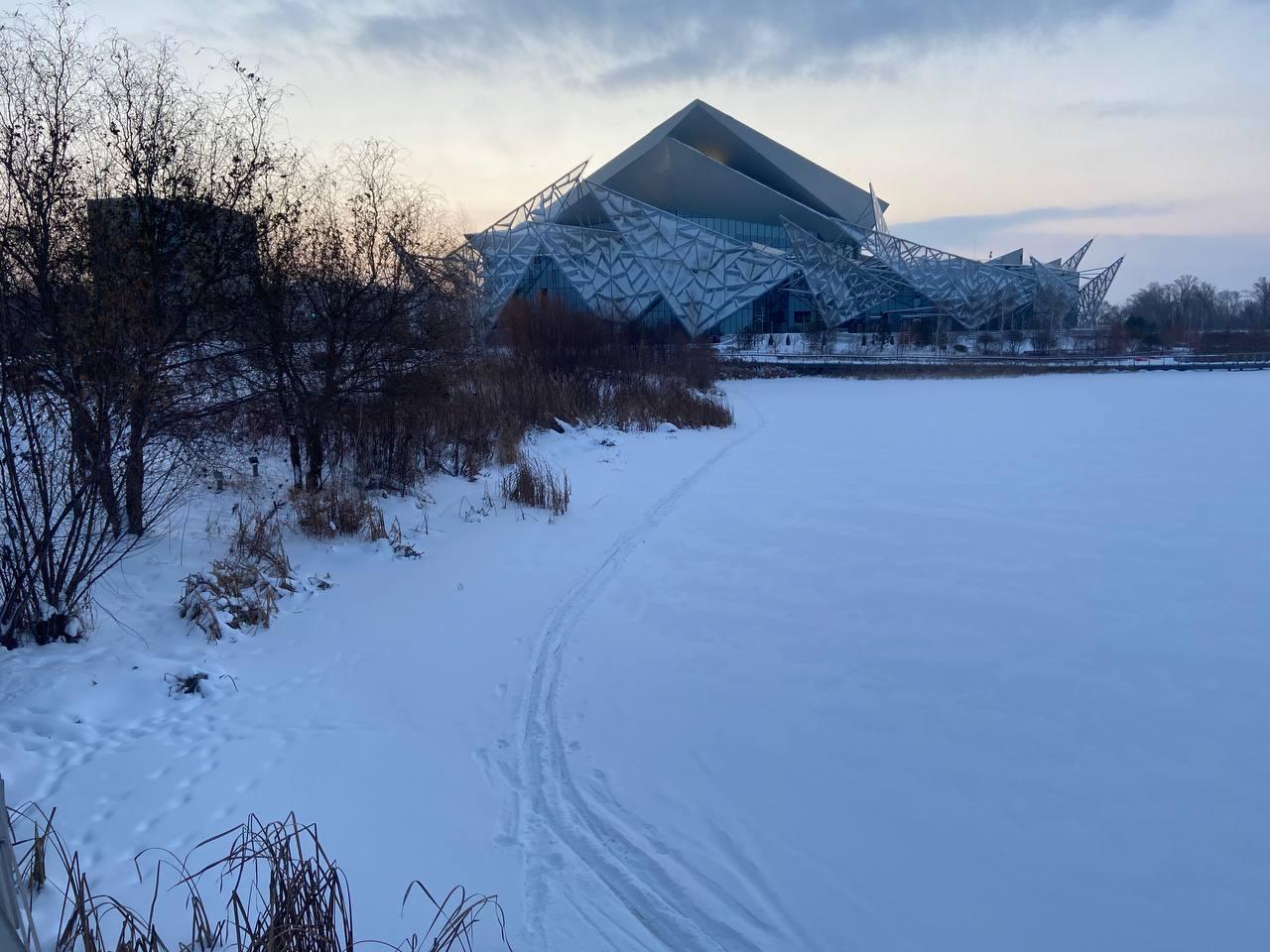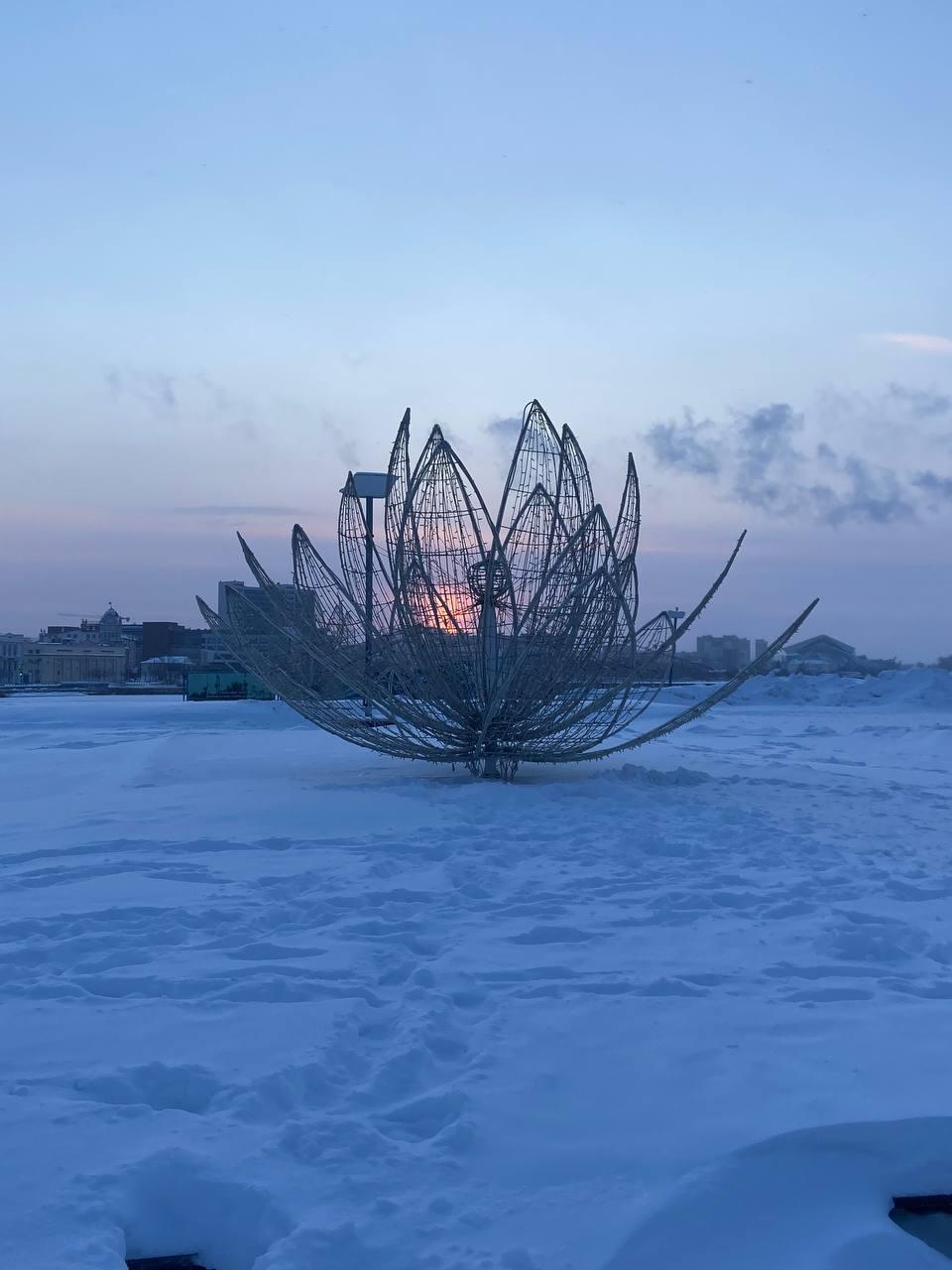 Набережная озера Кабан была абсолютно пуста. Театр имени Камала в одиночестве встречал первый день 2026 года на фоне дымящих труб ТЭЦ, а на заснеженной глади озера виднелись следы лыжника.