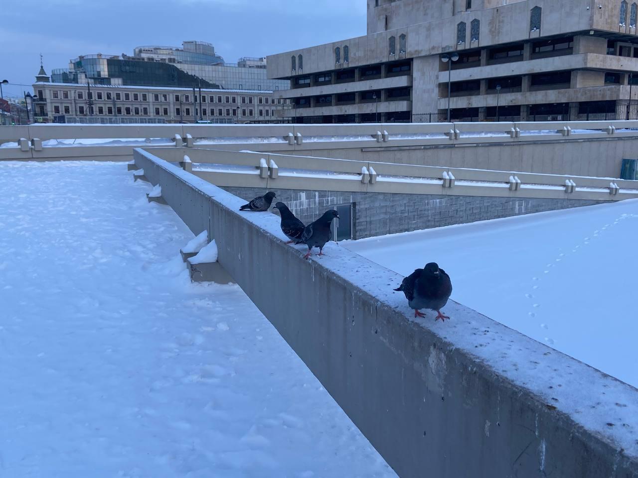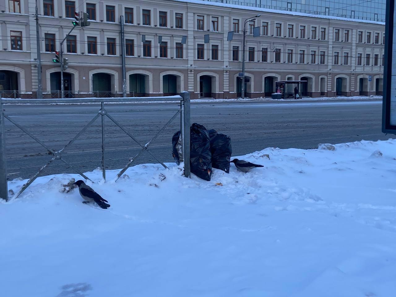 На смотровой площадке набережной голуби, не смущаясь, окружили фотографа. Еще более наглые вороны разрывали мусорный пакет в нескольких метрах от открытой урны.