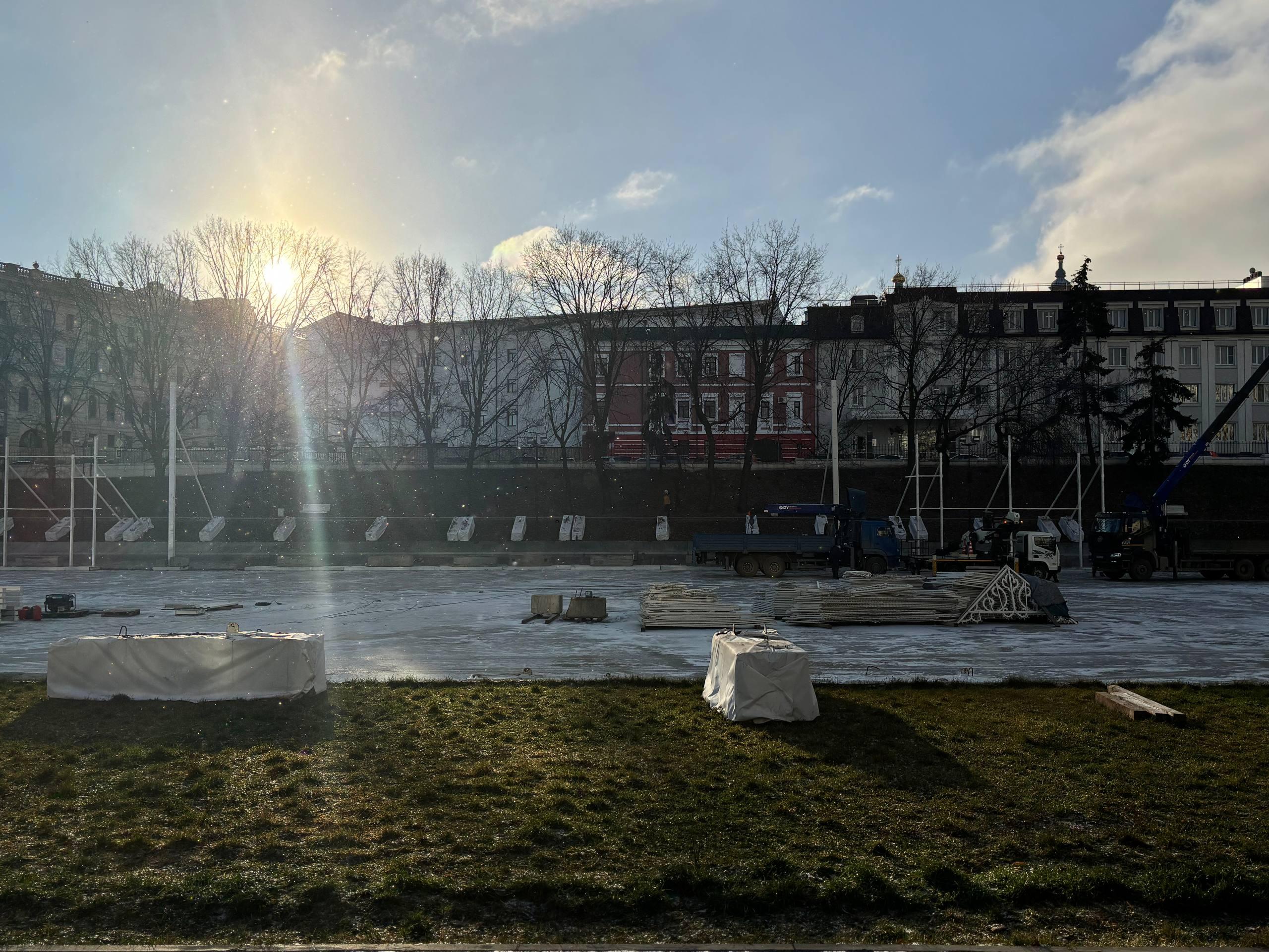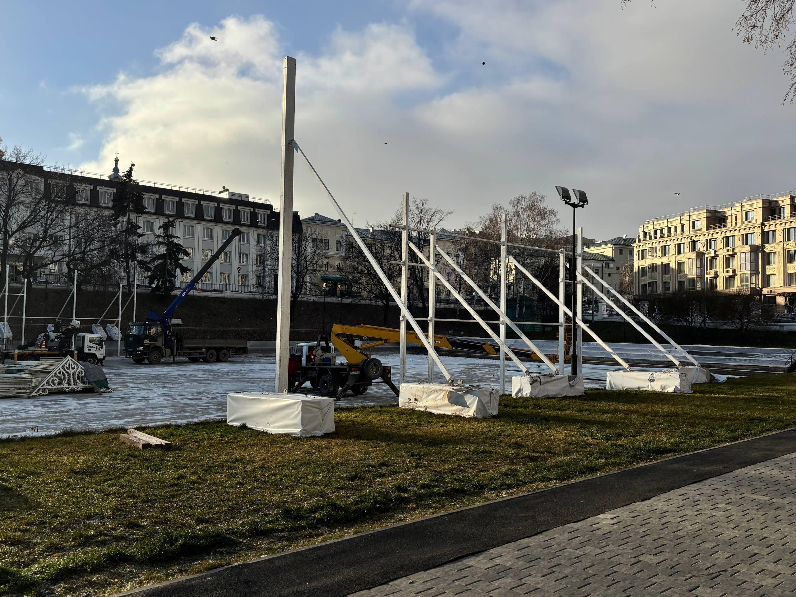 На месте работают грузовые автомобили и монтажники, собирающие каркас будущей световой композиции. Точных сроков сдачи объекта пока нет.