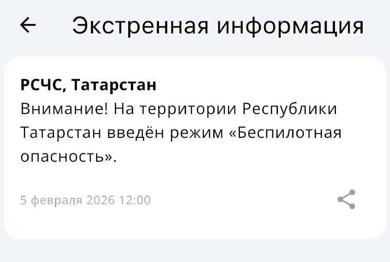 В Татарстане режим беспилотной опасности ввели сегодня на 18 минут, что стало вторым случаем за месяц. Оповещение от МЧС пришло в 12:00, а отмена последовала в 12:18.
