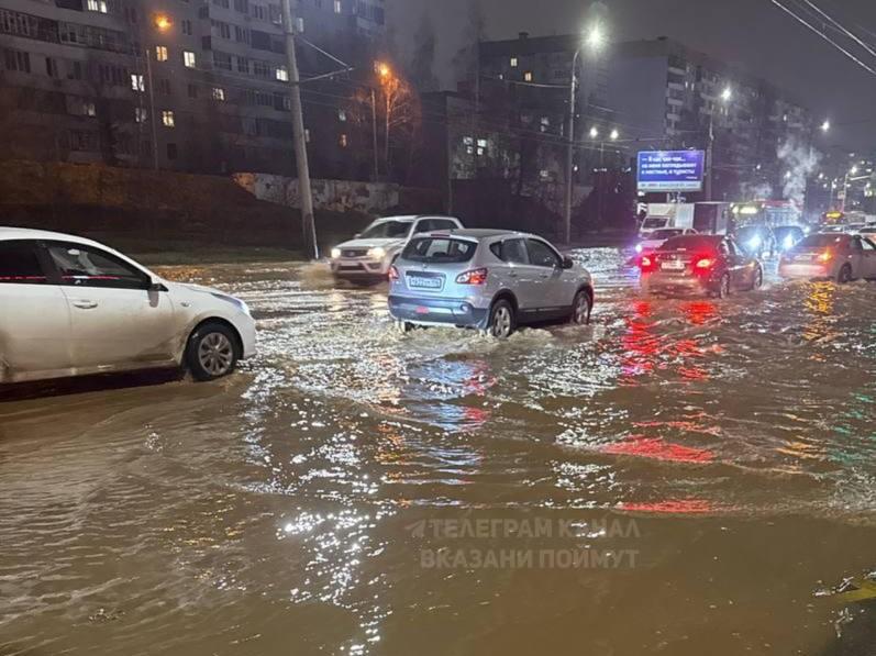 Проезжая часть на улицах Фучика и Чишмяле оказалась под водой сегодня вечером. Очевидцы рассказали, что один из автобусов провалился под асфальт. На этих участках образовались пробки.
