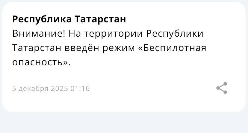 Режим беспилотной опасности начал действовать в Татарстане с 1:16 ночи.