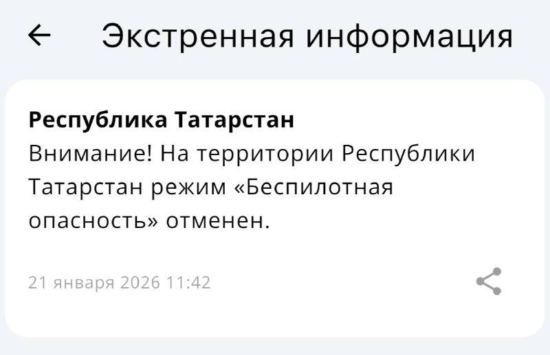 МЧС России отменило режим беспилотной опасности на территории Татарстана. Сообщение об этом ведомство разослало населению в 11:42.