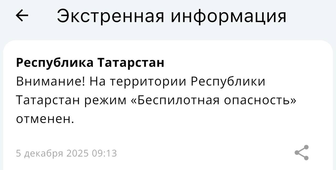 МЧС России объявило об отмене режима беспилотной опасности в Татарстане, который сохранялся на протяжении всей минувшей ночи.