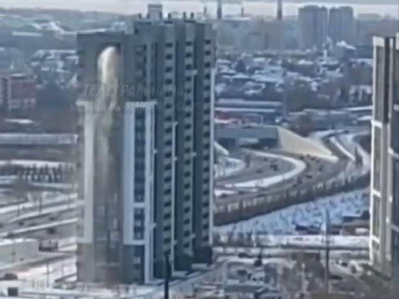 Видео с водяным потоком, падающим с многоэтажки, появилось в социальных сетях.