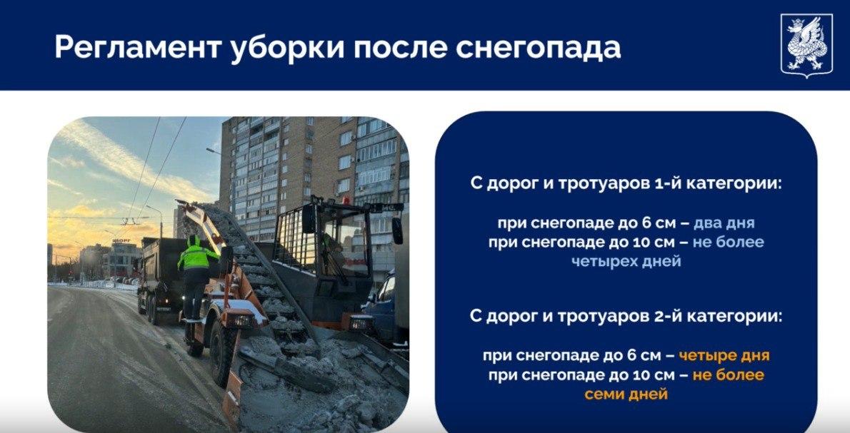 Сроки уборки также варьируются в зависимости от категории улицы. Для объектов первой категории при снежном покрове до 6 см отводятся два дня, а при высоте снега до 10 см — четыре дня. На дорогах и тротуарах второй категории уборка снега слоем до 6 см должна быть завершена за четыре дня, а при 10 см — за семь дней.
